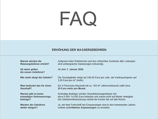 Die zusätzlichen und umfangreichen Sanierungsmaßnahmen führten insbesondere im Jahr 2025 zu erheblichen Mehrkosten. In der Gebührenkalkulation für den Zeitraum 2023–2025 zeigt sich deshalb für das Jahr 2025 eine deutliche Unterdeckung. Um weiterhin eine kostendeckende und sichere Trinkwasserversorgung gewährleisten zu können, hat die Verbandsversammlung am 18. November 2025 einer Erhöhung der Wassergebühren zum 1. Januar 2026 zugestimmt.