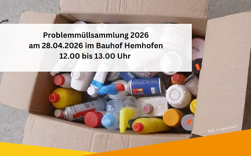 Der Termin für die Gemeinde Hemhofen zur Abgabe des Problemmülls im Bauhof, Peter-Händel-Straße 15 ist am Dienstag, den 28.04.2026 von 12.00 Uhr bis 13.00 Uhr.