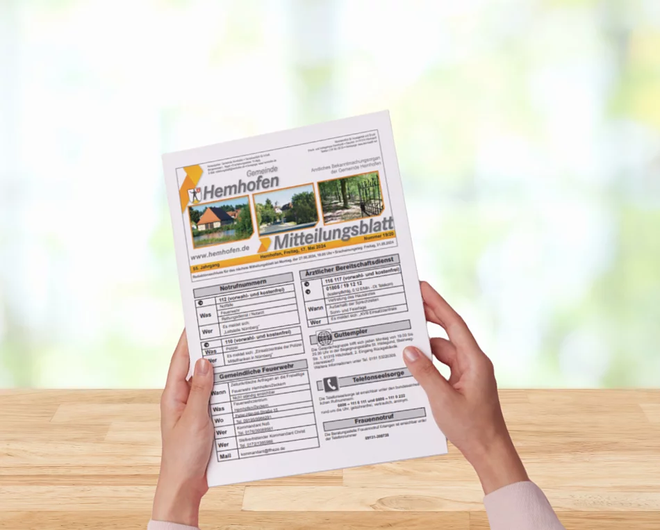 Die erste Ausgabe im Jahr 2026 erscheint in KW 2 am 09.01.2026. Der Redaktionsschluss ist der 05.01.2026, unabhängig vom Brückentag der Gemeindeverwaltung. Die Redaktion des Mitteilungsblattes wird an diesem Tag besetzt sein!