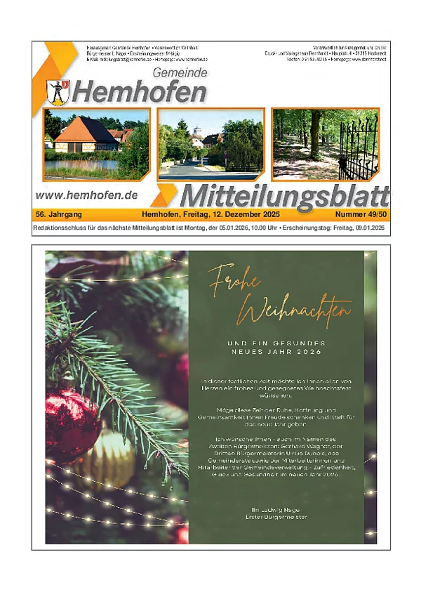 Seit dem 01.01.2016 wird das Mitteilungsblatt Hemhofen vom Druckhaus Dennhardt Verlag GmbH mit Sitz in Höchstadt herausgegeben.